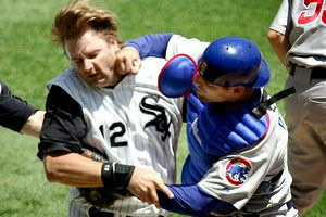 Barrett was the starting catcher for the Cubs for several seasons. He hit the ball well, clubbing 16 homers and knocking in more than 60 runs every year in Chicago, but he also had his difficulties defensively. Barrett is remembered most for three events. 1) He suffered a gruesome “twisted testicles” injury that made every man in Chicago grimace. 2) He and Carlos Zambrano got into a fistfight in the dugout/clubhouse, leading to a Barrett black eye. And most importantly 3) He earned the applause and respect of everyone in baseball when he punched taunting White Sox catcher A.J. Pierzynski in the face.